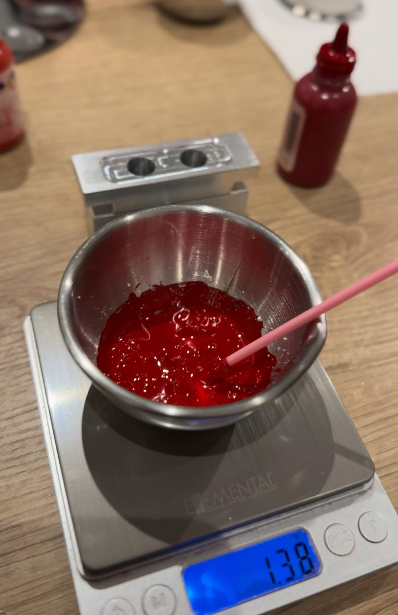 Nakon što su svi sastojci bili pomiješani, ruž je bio spreman za topljenje, a zatim smo ga pažljivo ulili u kalupe i ostavili na hlađenju u hladnjaku tridesetak minuta. Dok smo čekali da se ruževi stvrdnu, brzo smo pripremili i sjajilo. Njegova izrada još je jednostavnija – koristi se neutralna baza od ricinusovog i kokosovog ulja, bez boje i mirisa.