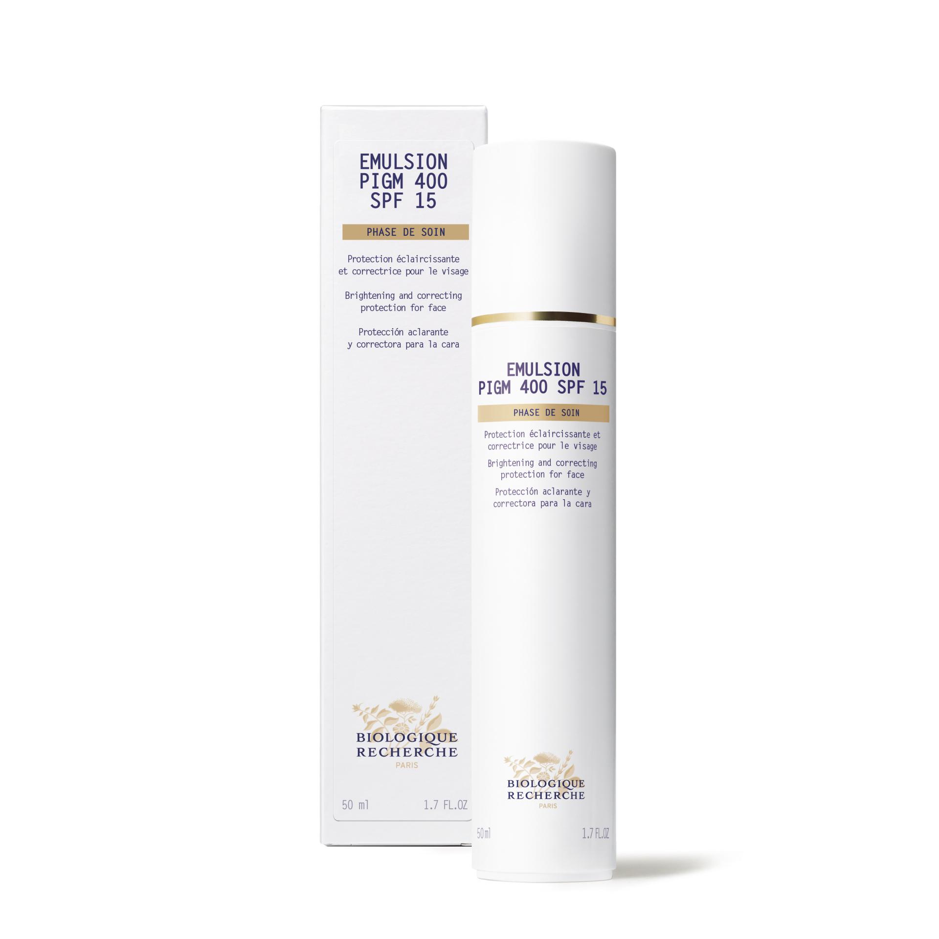 Inovativna emulzija Biologique Recherche Emulsion PIGM 400 SPF 15 namijenjena je za korekciju pigmentacijskih mrlja i dodatnu zaštitu od sunca, istovremeno pojačava blistavost te kožu čini trenutačno svjetlijom, a ten ujednačenijim. I zaštitna i korektivna, emulzija koja je nastala u laboratorijima Biologique Recherchea posebnom metodologijom iza koje stoji 40-godišnje iskustvo, može se koristiti svakodnevno. Ima ugodno laganu i tekuću teksturu.