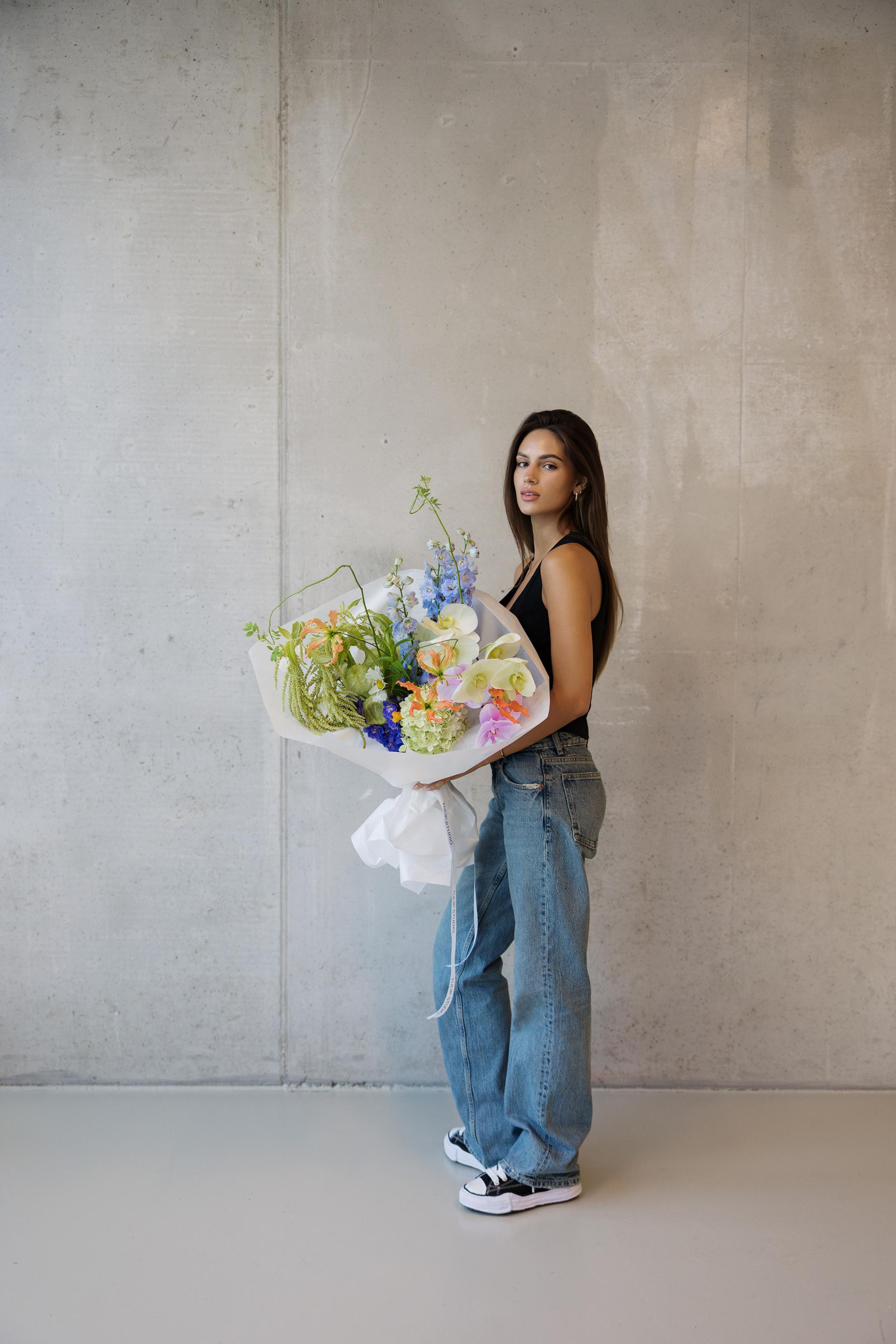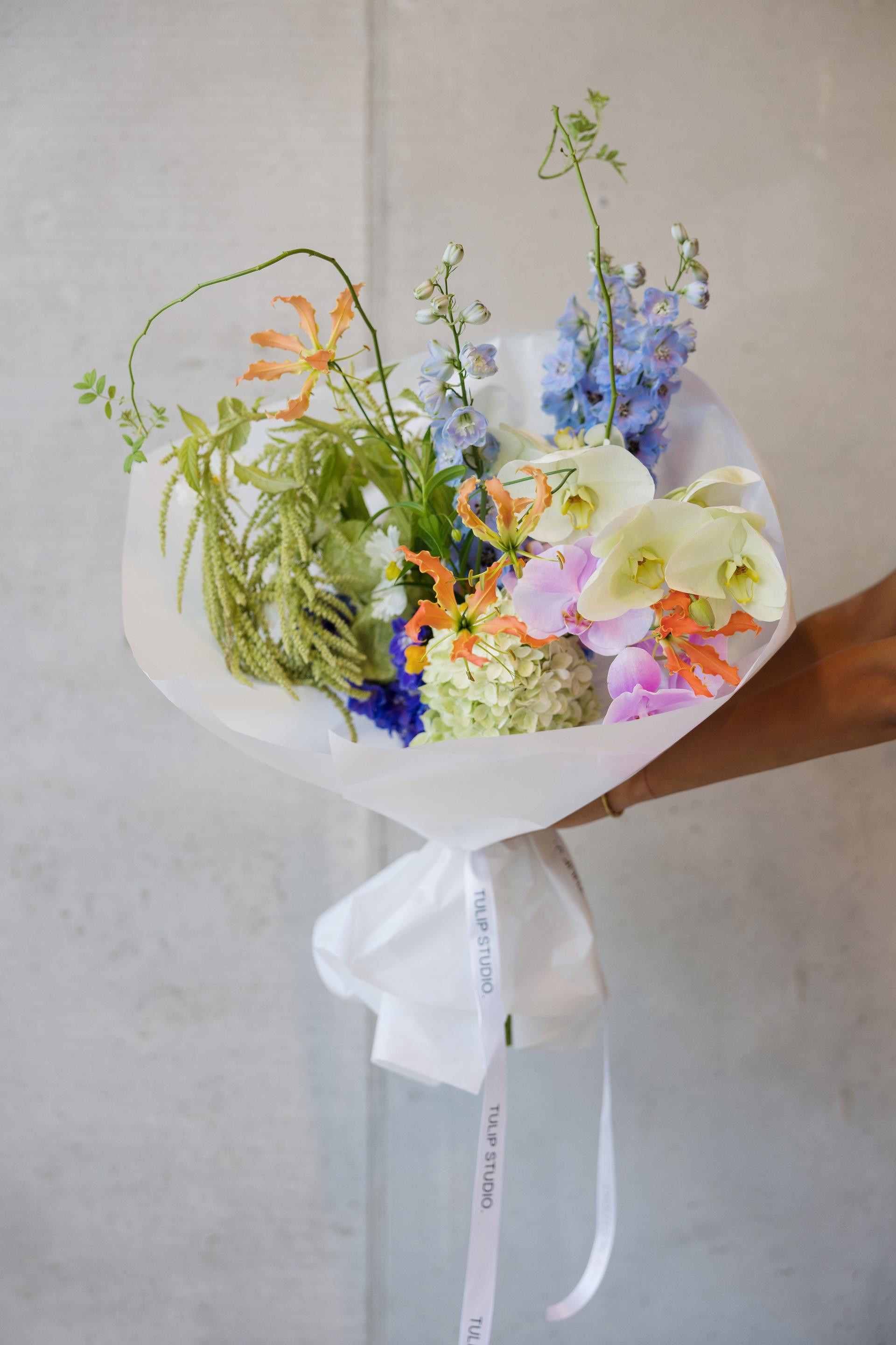 Ovaj jedinstveni buket odiše egzotikom i svježinom te je, kako nam otkrivaju iz Tulip Studija, zamišljen kao oda posljednjim danima ljeta. U njemu se stapaju zelene viseće grane amaranthusa, nekoliko raskošnih nijansi phalaenopsis orhideja, divlje grane ruže, dramatična egzotična gloriosa u jarkoj narančastoj te elegantni delfinijum. Cvijeće je pažljivo birano, a rezultat je cvjetna kompozicija koja izgleda kao da je došla ravno iz boho sna – odvažna, slobodna i neodoljivo chic.