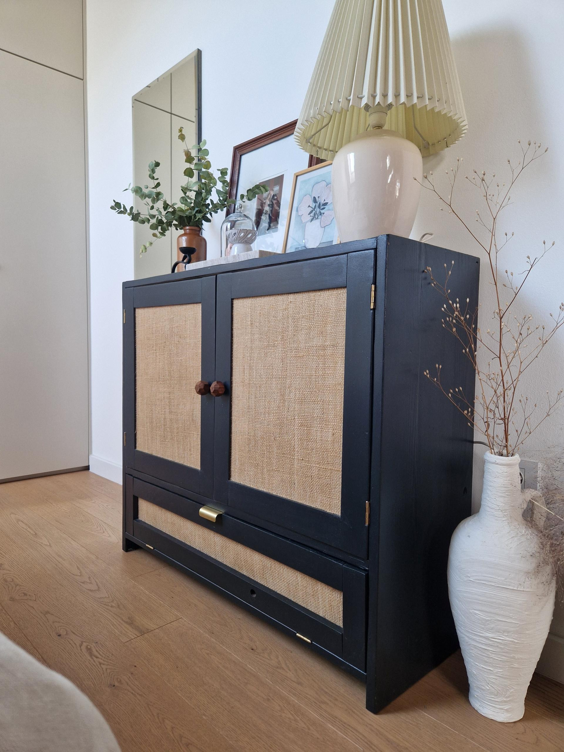"Jedan od njih bio je dio stare vitrine koju je netko ostavio na uglu ulice. Dijelovi su bili načeti vlagom, a kad sam krenula micati oštećene dijelove – raspao se u daske. Većina bi u tom trenu odustala, ali ja sam ih spojila u prvotni oblik. Iako sam uvijek za to da se originalan izgled namještaja sačuva i da patina i svaki trag korištenja budu ponosni svjedoci prošlosti, u ovom slučaju sam se odlučila za potpuno novi izgled. Inspiraciju sam pronašla u teksturi jutene tapete koja je krasila zidove kuhinje kad sam bila mala i koju sam umetnula na fronte komode. Daske prepune tragova popravaka prebojala sam u tamnoplavu boju i kao točku na i odabrala različite ručkice za vrata koje predstavljaju spoj kvalitetnog ručnog rada i novog, suvremenog stila komode", nabraja Maja.