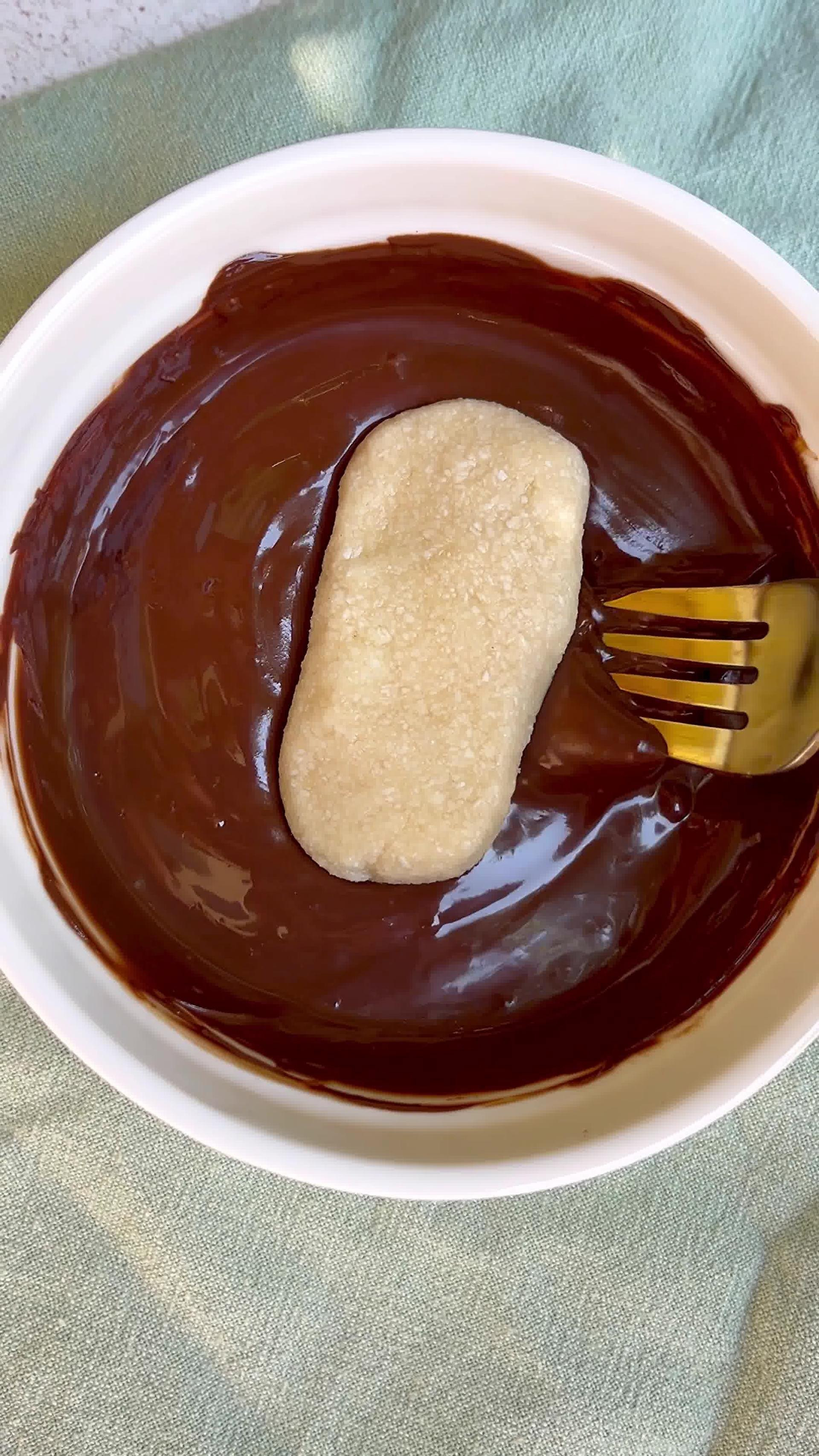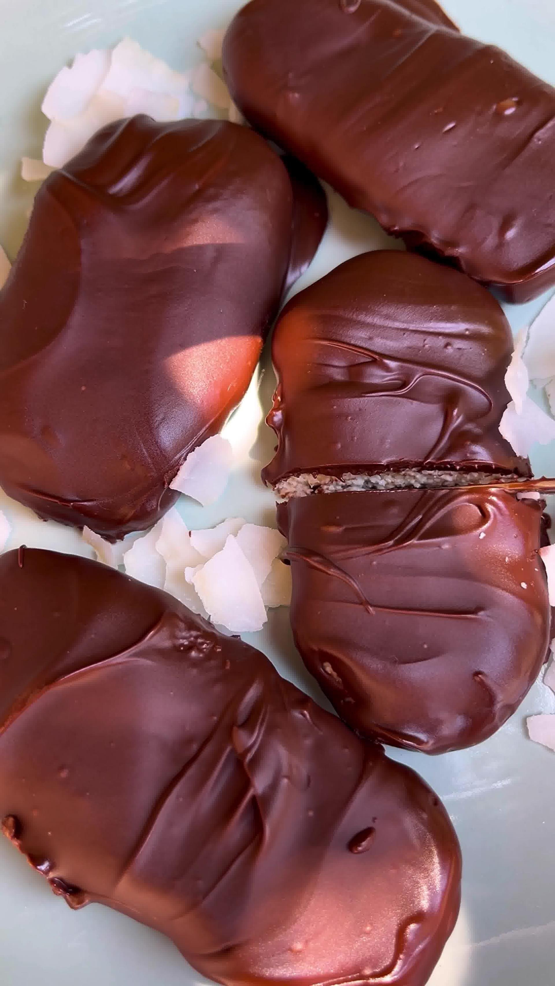 Vlažnim rukama oblikujte pločice ili kuglice pa ih slažite na pladanj obložen masnim papirom. Stavite sve nakratko u zamrzivač dok se pločice ne stisnu, za što će biti potrebno oko 20 minuta. U međuvremenu otopite tamnu čokoladu na pari. Pločice obložite rastopljenom čokoladom sa svih strana i slažite na masni papir. Dodatno ohladite u frižideru dok se čokolada ne stisne i uživajte!