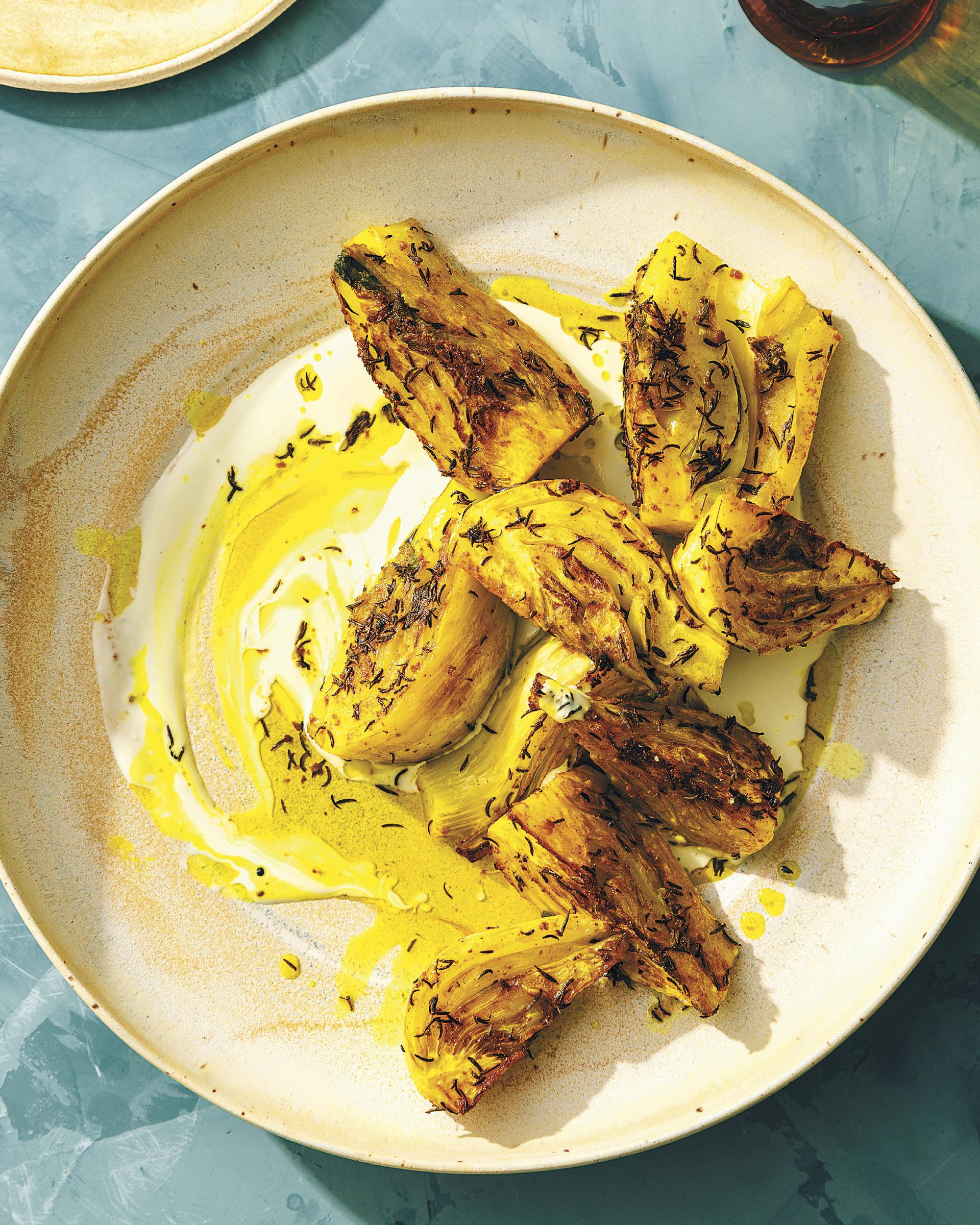 Ako se koriste male glavice komorača, narezati ih na četiri kriške, veliku glavicu narezati na osam kriški. U oba slučaja jezgru komorača ostaviti uz kriške jer se tada neće raspasti kod kuhanja. U srednje velikoj tavi zagrijati maslac na jakoj vatri. Dodati sjemenke kumina pa, uz povremeno miješanje, pržiti dok ne počnu pucketati, otprilike dvije minute. Smanjite vatru na srednje slabu pa dodati sol, kurkumu i asafetidu. Pržiti, uz miješanje, dok začini ne zamirišu, otprilike 30 sekundi. Dodati komorač, poklopiti tavu i pržiti dok komorač malo omekša, ali je još hrskav, otprilike 10 minuta. Otklopiti, pojačati vatru na srednje jaku i pržiti, uz povremeno okretanje komorača, dok ne poprimi intenzivnu zlatnosmeđu boju, još 2 - 3 minute. Skinuti tavu s vatre i ostaviti sa strane. Za umak u blenderu pomiješati jogurt, korijandar, limunov sok i sol pa obrađivati dok se ne dobije glatka mješavina. Na tanjuru za posluživanje načiniti postelju od umaka pa na nju rasporediti kriške komorača ili jednostavno komorač preliti umakom. Poslužiti toplo.