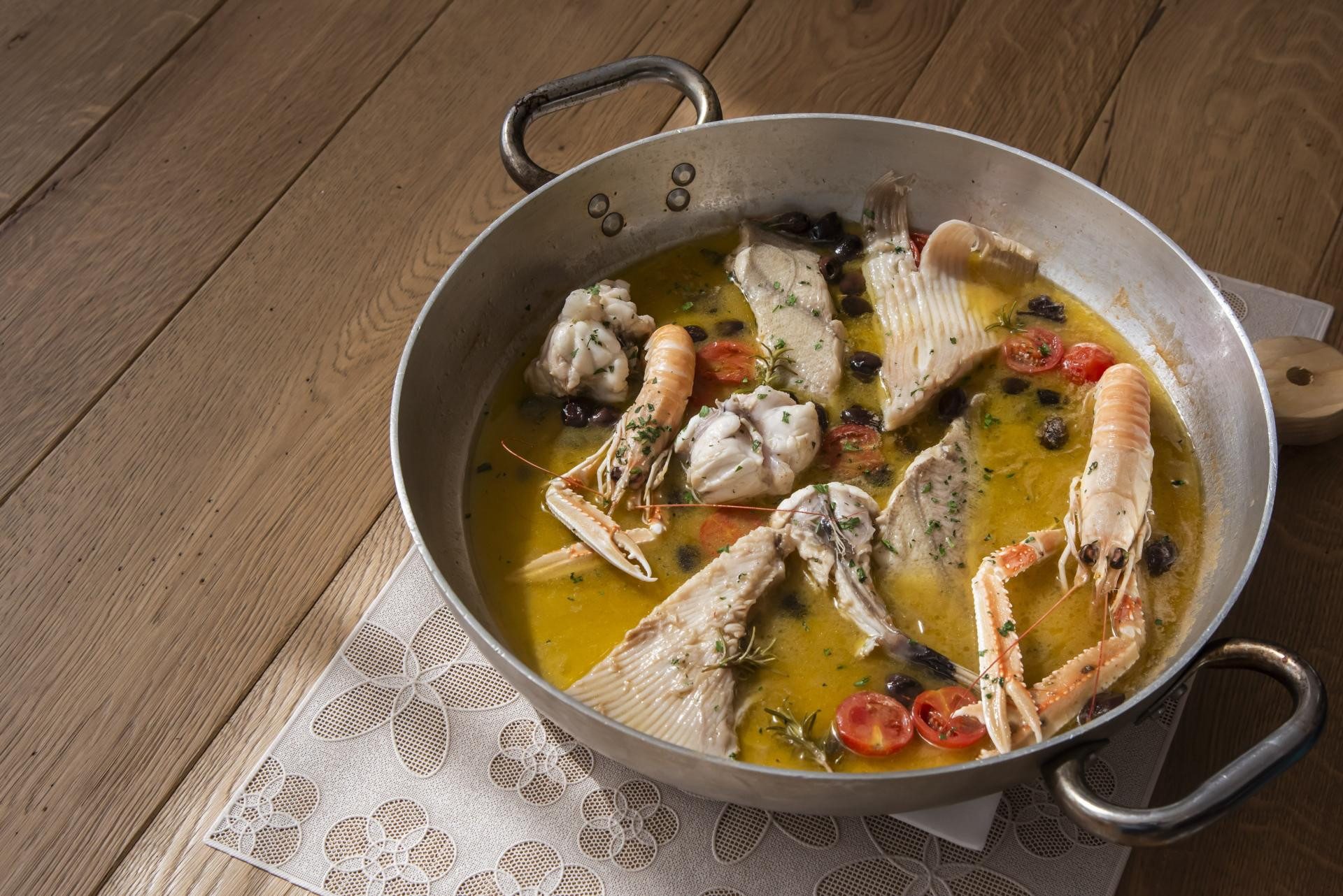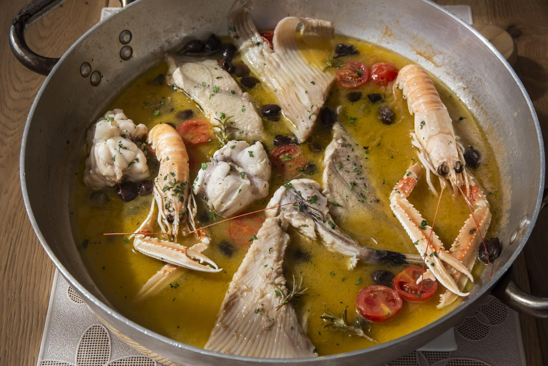 U posudi pomiješati maslinovo ulje, riblji temeljac i vino. U tekućinu ubaciti sve ostale sastojke osim ribe i pustiti da kratko prokuha. U dobivenu emulziju staviti ribu i morske plodove te kuhati dok se tekućina ne reducira za 1/3 i sve zajedno ne emulgira. Po ukusu začiniti. Poslužiti u posudi u kojoj se kuhalo, uz palentu ili prepečeni kruh.
