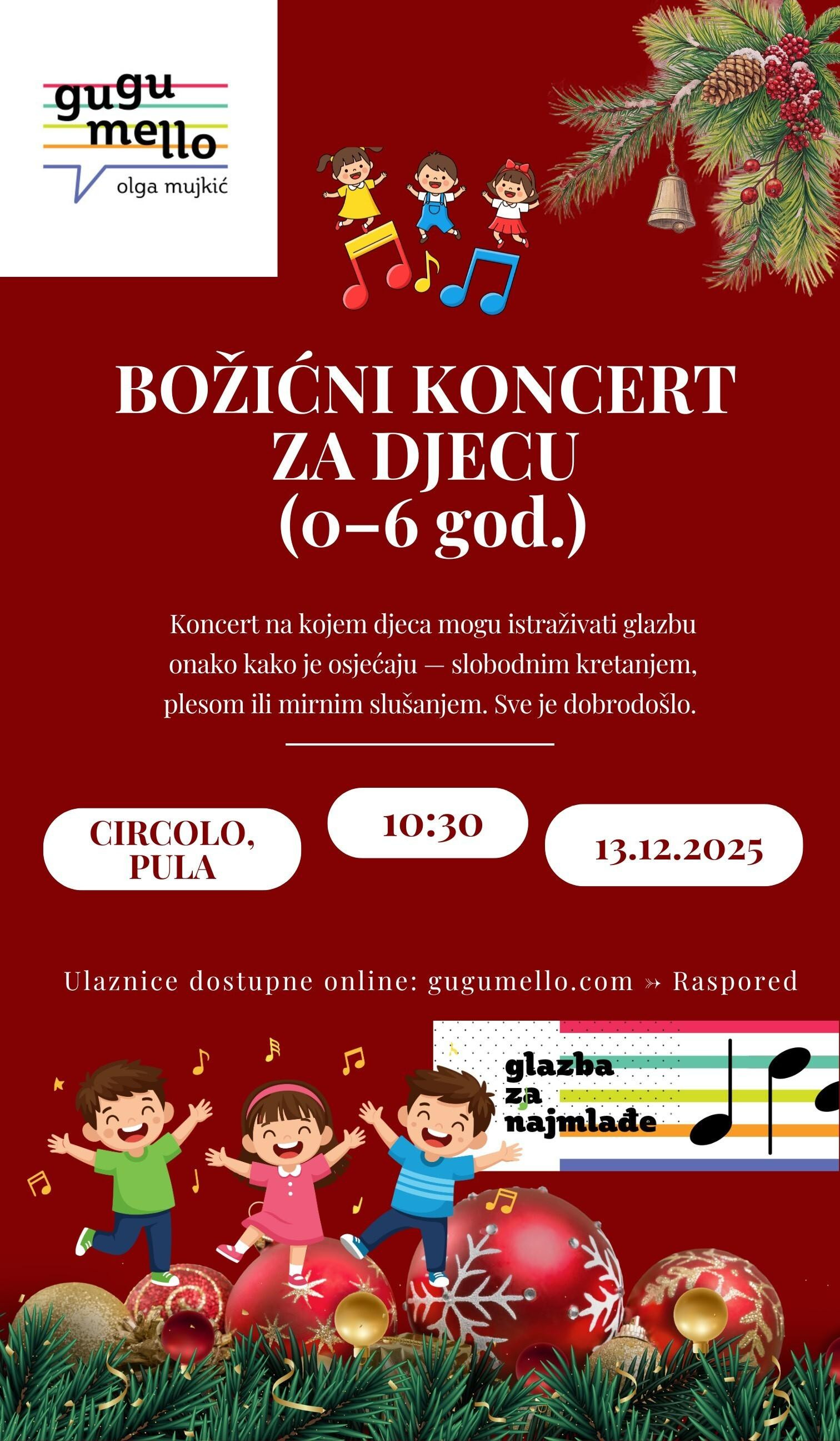 Blagdansko vrijeme donosi najviše radosti upravo najmlađima, a ove godine Pula će dobiti događaj koji će cijeloj obitelji ostati u posebnom sjećanju. U petak, 13. prosinca u 10:30 sati u Circolu održat će se Gugumello – Božićni koncert za djecu od rođenja do šeste godine, nježno osmišljen glazbeni susret u kojem se djeca osjećaju slobodno, sigurno i prihvaćeno.