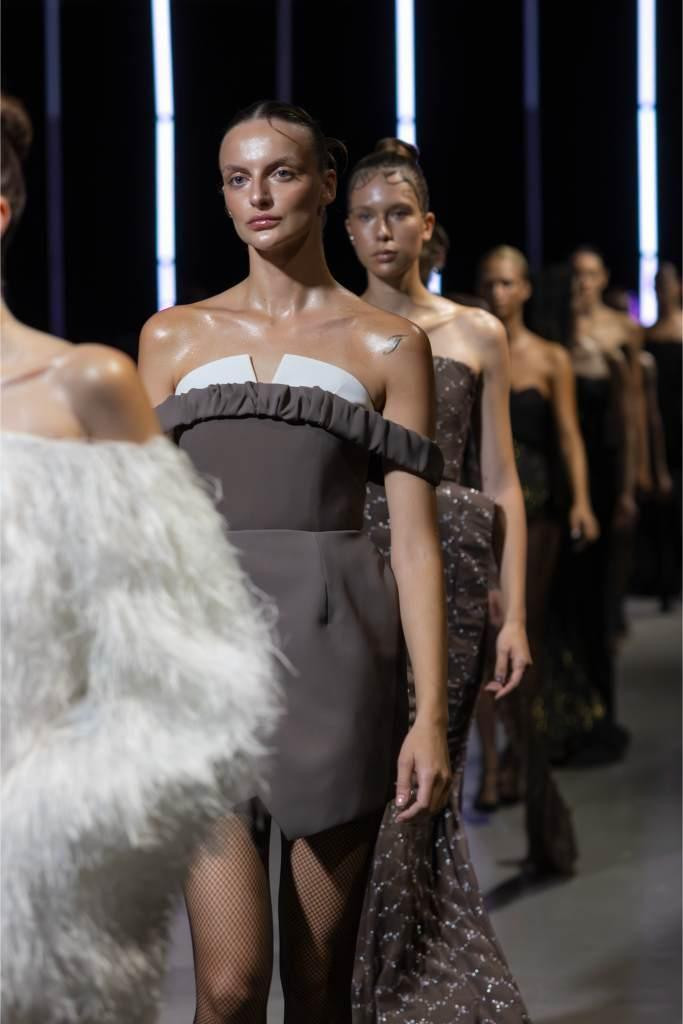 Paleta boja dodatno je podcrtala jasnoću koncepta: crna i bijela, kao temelj kontrastne igre, sofisticirana taupe nijansa, koja lebdi između sive i smeđe s maslinastim podtonom, kao znak promišljene suzdržanosti, te neonsko-žuta koja je u trenutku probijala ozbiljnost i unosila futuristički, električni naboj. Zvukovi odabrani za reviju nisu bili tek glazbena podloga, već savršeno iscrtana atmosfera kolekcije – ritmovi intenzivni i odlučni, mjestimice mračni, a ipak ispunjeni energijom koja je poticala osjećaj snage i samouvjerenosti na pisti.