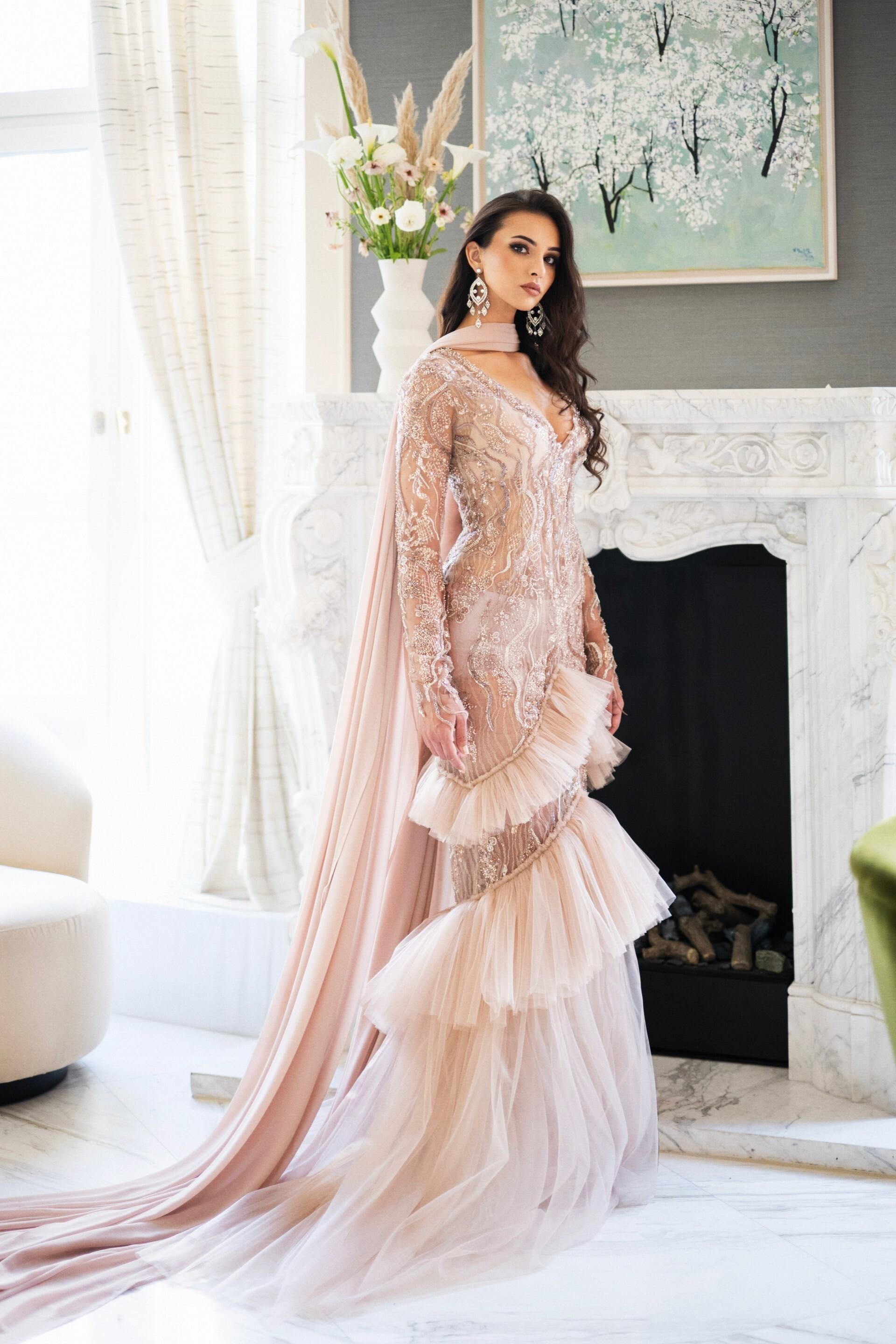 Marina je dizajnirala i haljinu za finalnu večer koja sadrži ručno vezene čipke koje su se vezle preko 300 sati. "Koristila sam kristale Swarovski, prljavo je roza podloga, a gore su zlatne i srebrne perlice. Korišteno je i 16 metara tila i svileni šal oko vrata koji je dugačak sedam metara" govori dizajnerica.
