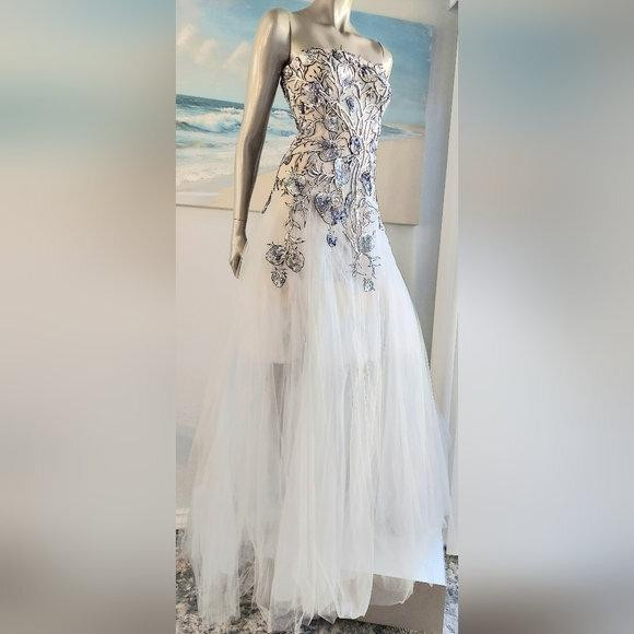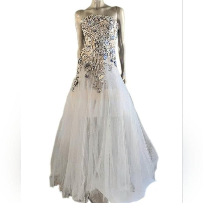 Gornji dio prati liniju tijela, dok se suknja širi u klasičnu balsku siluetu, s više slojeva tila koji stvaraju dubinu i pokret. Površina je bogato teksturirana zahvaljujući gusto raspoređenim aplikacijama, koje reflektiraju svjetlo bez prejakog sjaja. Unutarnja konstrukcija osigurava stabilnost i oblik.
