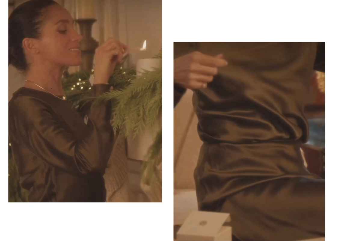 Naime, vojvotkinja od Sussexa zablistala je u elegantnom satenskom kompletu u maslinastozelenoj nijansi, koji joj savršeno pristaje, a riječ je o dizajnu njujorškog modnog brenda Argent koji Meghan i inače vrlo rado nosi.