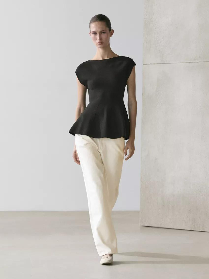 U ovoj su se modnoj kombinaciji široke traperice odlično uklopile s bež vestom s decentnom zlatnom dugmadi i V-izrezom s neočekivanim detaljem. Peplum je prije desetak godina bio jedan od najvećih trendova u svijetu bluza, topova i majica, a čini se da se sada ponovno vraća u modu.