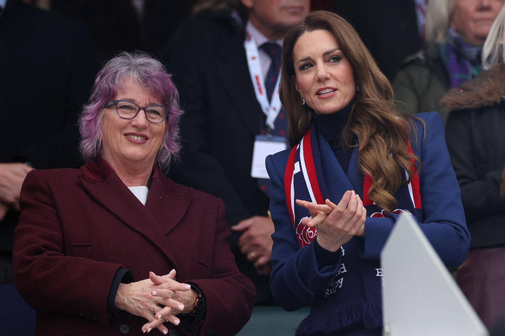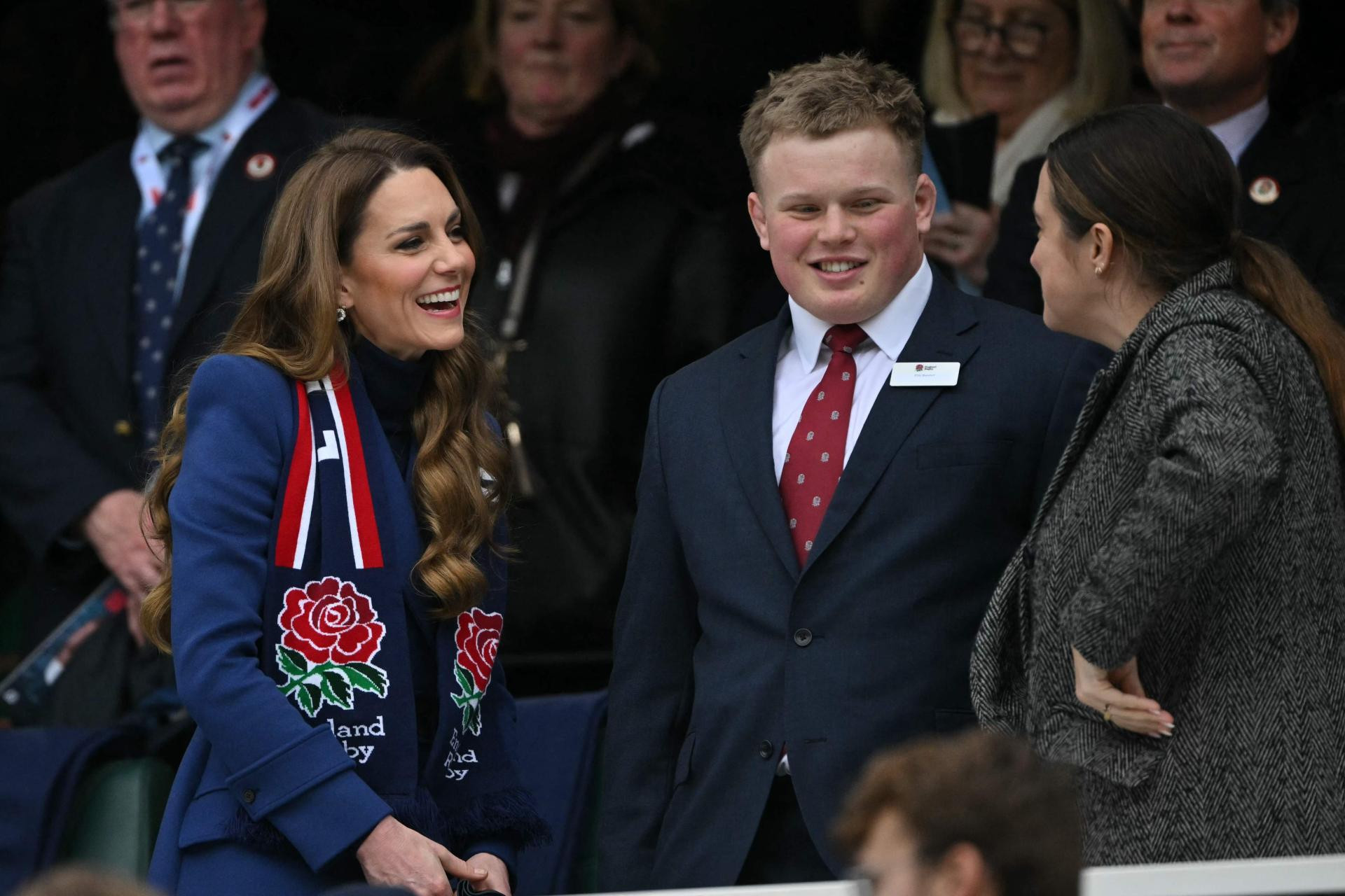 I dok je na ušima nosila naušnice sa safirima i dijamantima ovalnog oblika, jedan je detalj privukao više pažnje – šal koji je nosila u znak podrške engleskoj reprezentaciji ragbija. Tamnoplavi šal odlično se uklopio u kombinaciju s njezinim kaputom, a dodao je i malo boje zahvaljujući velikim crvenim ružama.