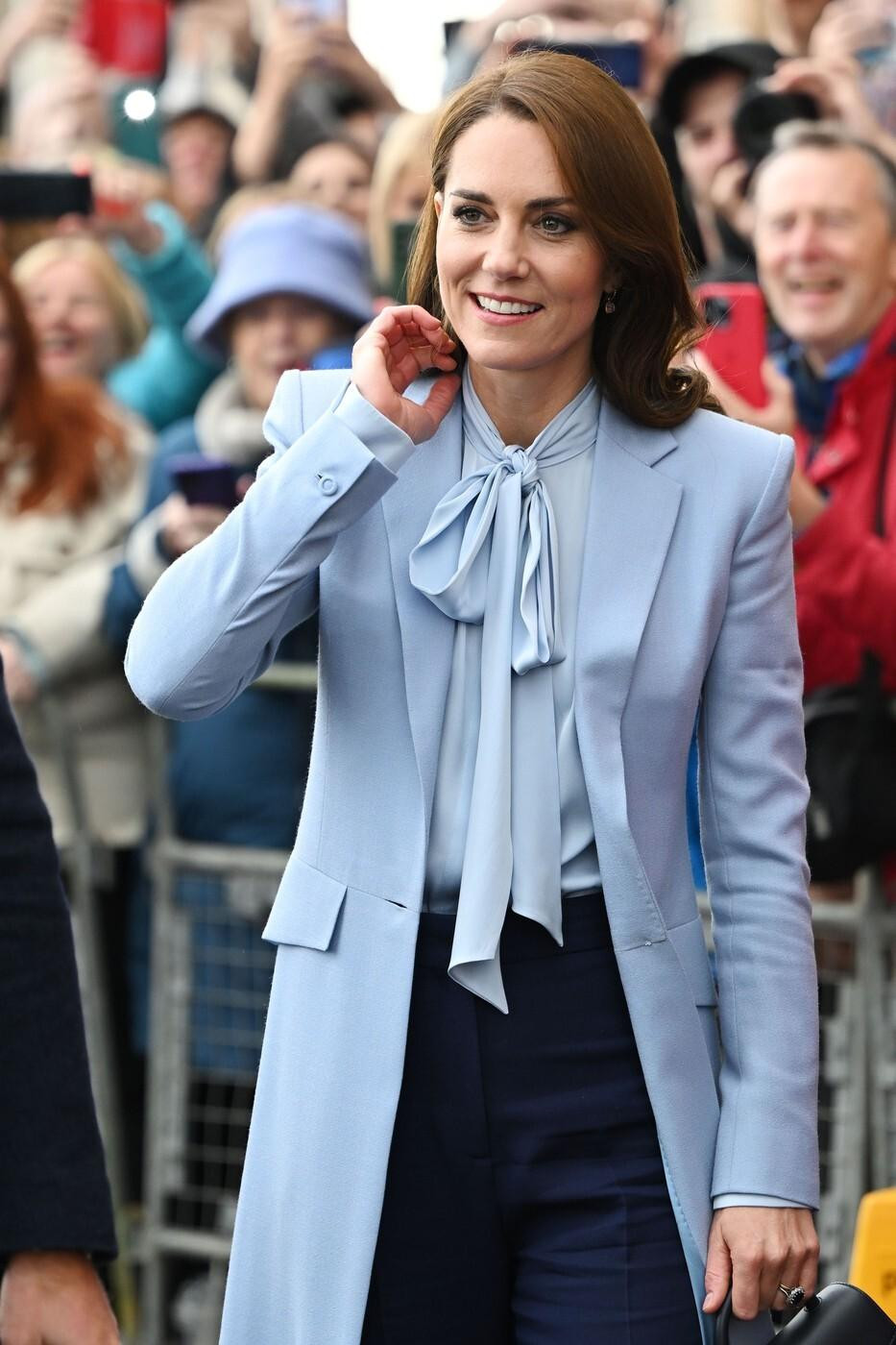 Uzmimo za primjer outfit koji je Catherine izabrala za susret s prijestolonasljednikom Al Husseinom bin Abdullahom II. i jordanskom princezom Rajwom. Tada je uparila bluzu s kostimom boje kave od Rolanda Moureta, a mnogi se još dobro sjećaju ljubičaste Gucci bluze koju je također krasila mašna oko vrata, nosila ju je 2019. godine prilikom posjeta Dječjem centru Henry Fawcett ili svijetloplave Winser London bluze koju je nosila tijekom putovanja u Sjevernu Irsku s princom Williamom 2022. godine.