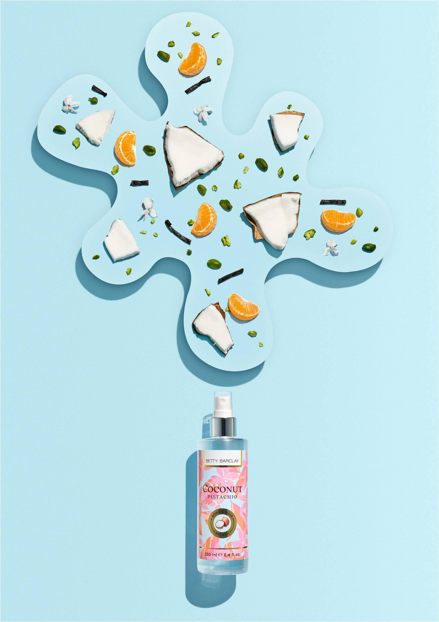 Kada temperature porastu, Body & Hair Splash proizvodi postaju idealan završni ljetni touch: lagani su, osvježavajući i mogu se nanijeti u bilo kojem trenutku - čak i na kosu! Zahvaljujući gurmanskim notama kokosa, pistacije i vanilije, Betty Barclay Coconut Pistachio pruža dugotrajan miris na koži i kosi.
