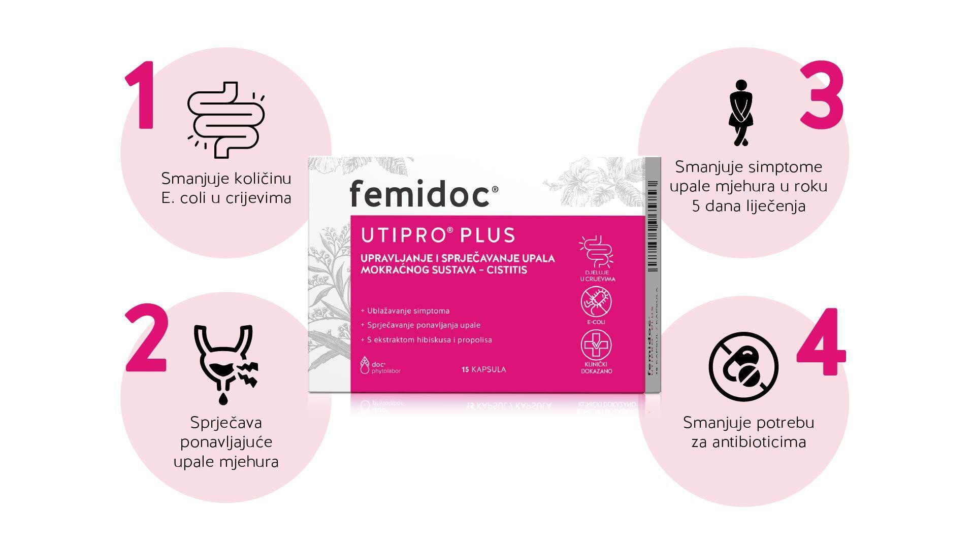 Revolucionarni femidoc® UTIPRO® PLUS donosi suvremeni pristup i pomaže prekinuti začarani krug ponavljajućih upala. Izlazak iz ciklusa ponavljajućih infekcija vraća osjećaj sigurnosti i slobode jer borba protiv upala mjehura nije samo pitanje liječenja simptoma, već i pitanje kvalitete života.