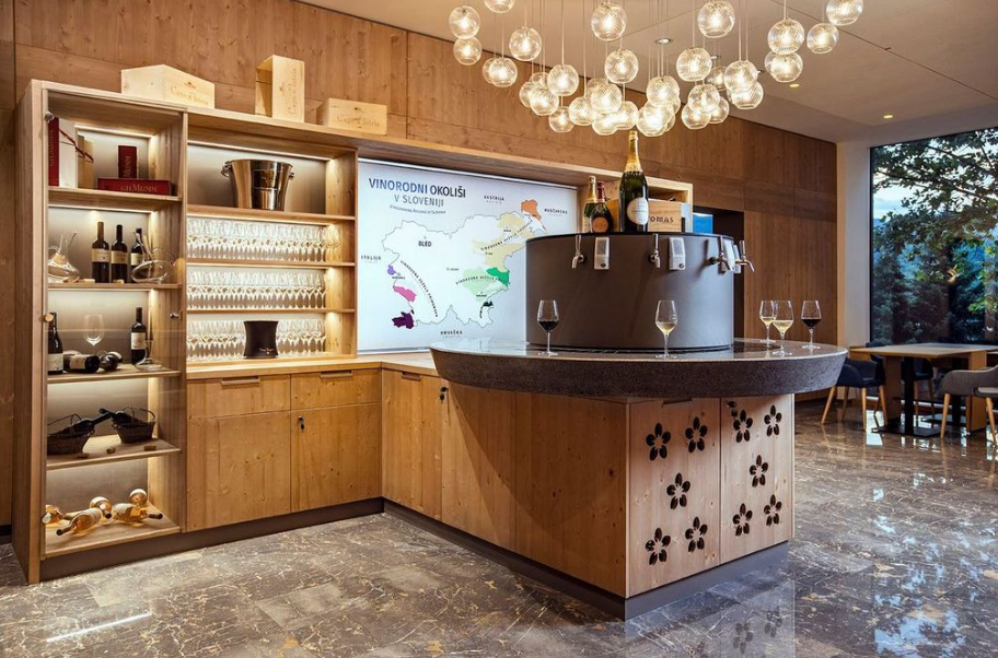Fontana sa svježom alpskom vodom donosi prirodno osvježenje tijekom cijelog dana, a vinska fontana omogućuje vam kušanje biranih slovenskih vina. Čaša vina uz pogled na jezero postaje trenutak koji spaja okus, prostor i raspoloženje. Dva jednostavna, ali nezaboravna rituala upotpunjuju bledsko iskustvo s osjećajem ležernog luksuza.