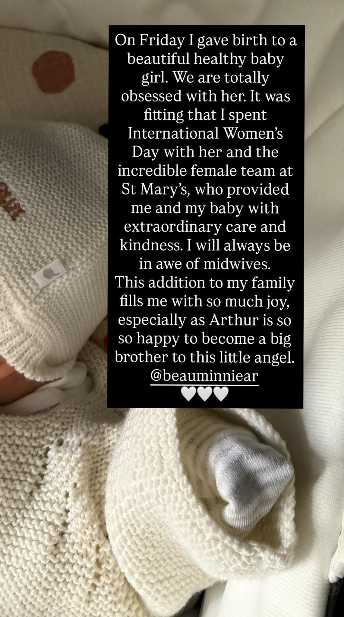 "U petak sam rodila predivnu i zdravu djevojčicu. Potpuno smo očarani njome. Bilo je prikladno što sam Međunarodni dan žena provela s njom i nevjerojatnim ženskim timom u St. Mary rodilištu, koji su meni i mojoj bebi pružili izvanrednu brigu i ljubaznost. Uvijek ću imati veliko poštovanje prema primaljama", napisala je.