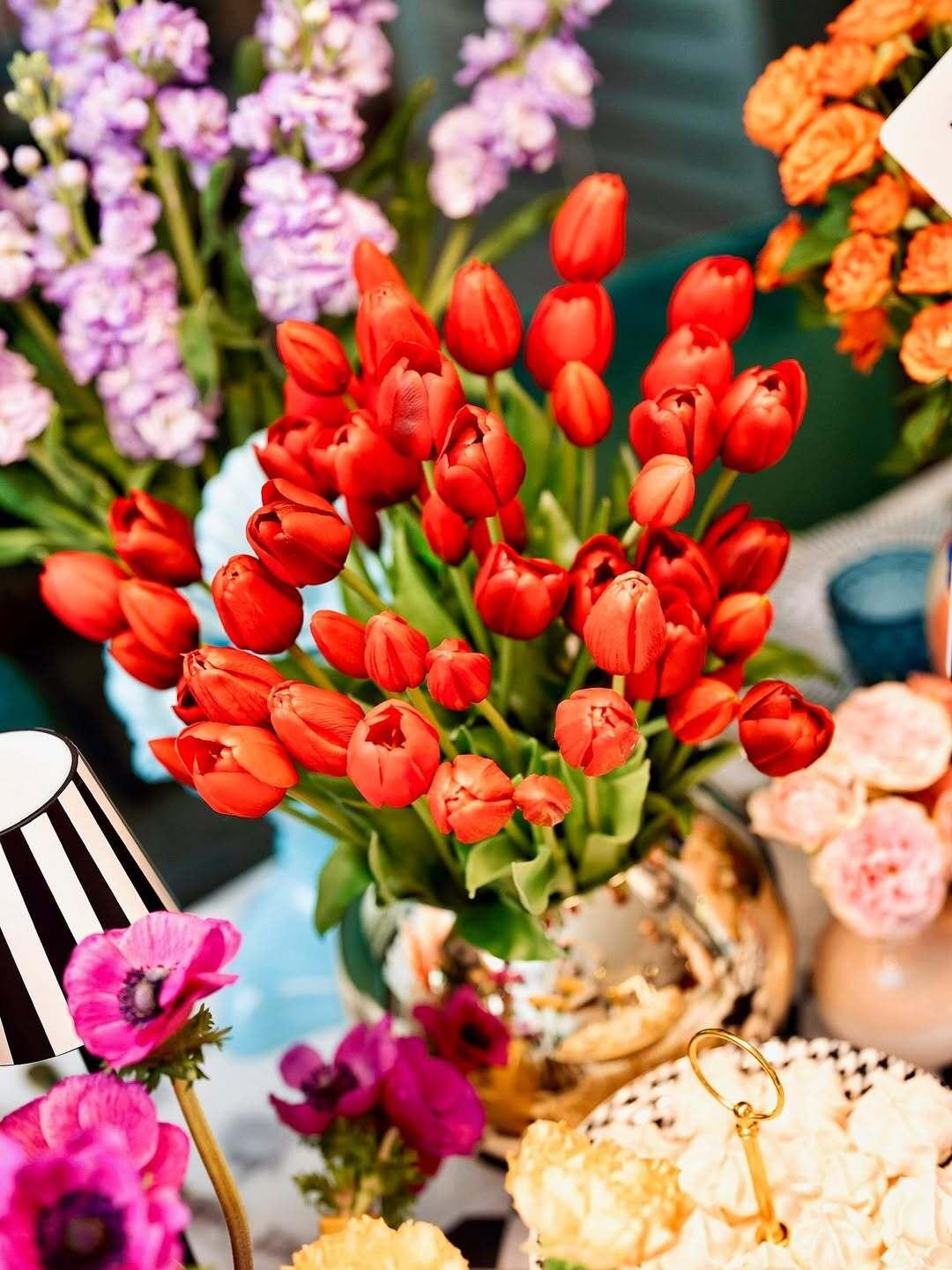 Cvjetni aranžmani igraju ključnu ulogu. Intenzivno crveni tulipani, ljubičasti i narančasti cvjetovi te bogato složene vaze stvaraju osjećaj raskoši, ali bez težine. Sve djeluje živo i pomalo razigrano – baš kao proljeće.