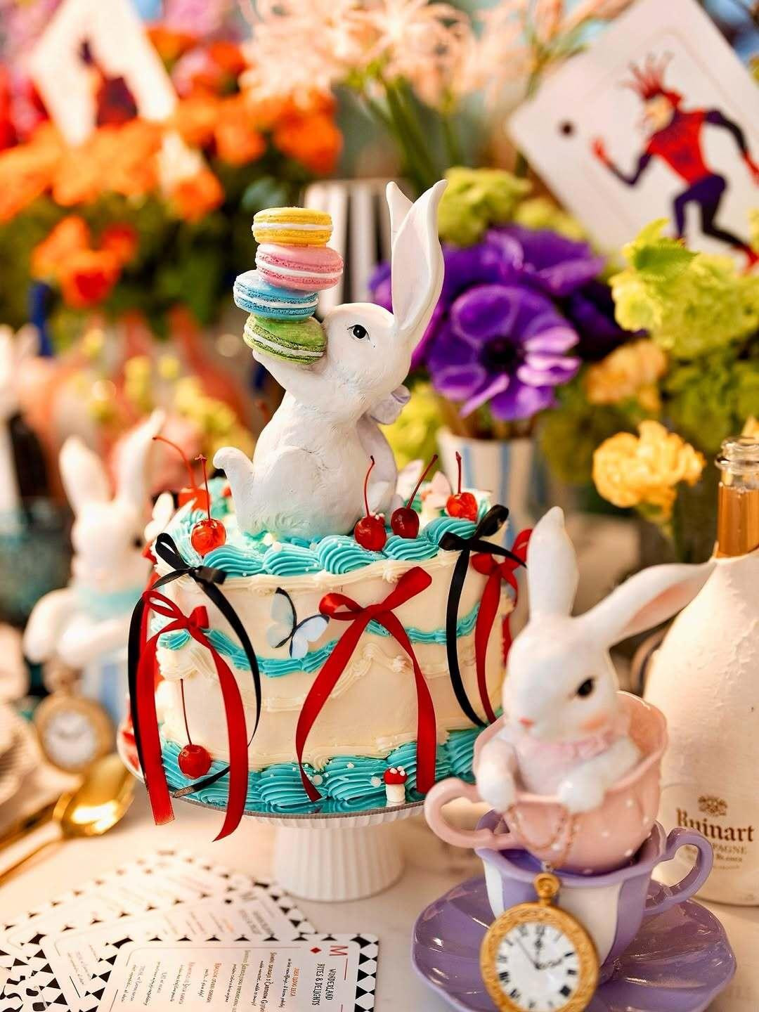 Središnji element je raskošna torta koja izgleda kao da je stigla ravno iz neke fantastične čajanke. Ukrašena tirkiznim kremama, crvenim mašnama i trešnjama, na sebi ima i nezaobilazni motiv bijelog zeca. Uz nju, mali zečevi proviruju iz šalica, a detalji poput džepnog sata dodatno pojačavaju dojam da je vrijeme u ovom prostoru, barem nakratko, stalo.