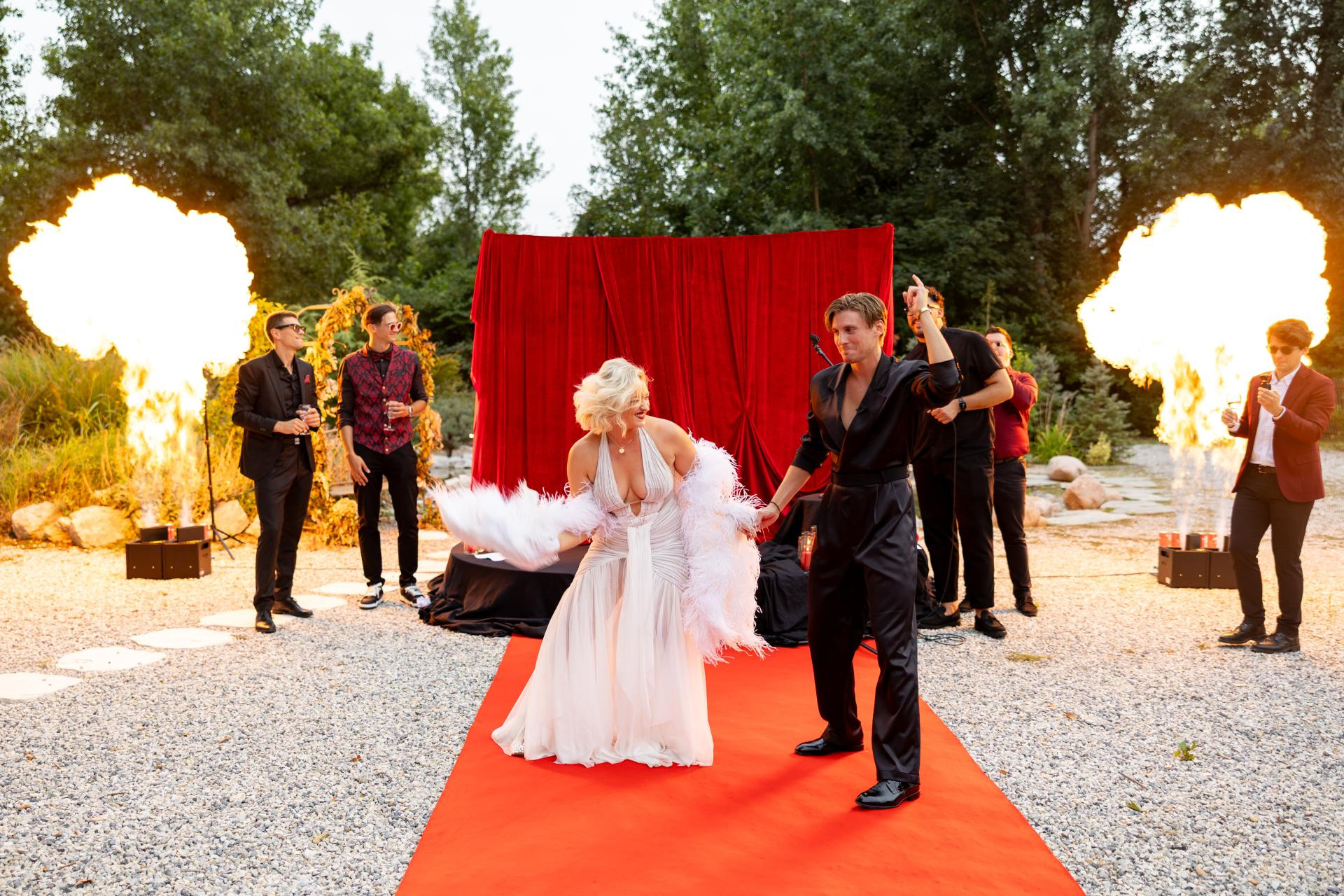 Vizualni koncept svadbe bio je podijeljen u dva dijela – prvi dio, onaj na otvorenom, bio je osmišljen u stilu glamura starog Hollywooda. Gosti su odmah po dolasku bili fotografirani uz veliki set u produkciji Glam seta, s fotografijama s vjenčanja na Korčuli i zaruka, čime su mladenci elegantno spojili dva važna trenutka.