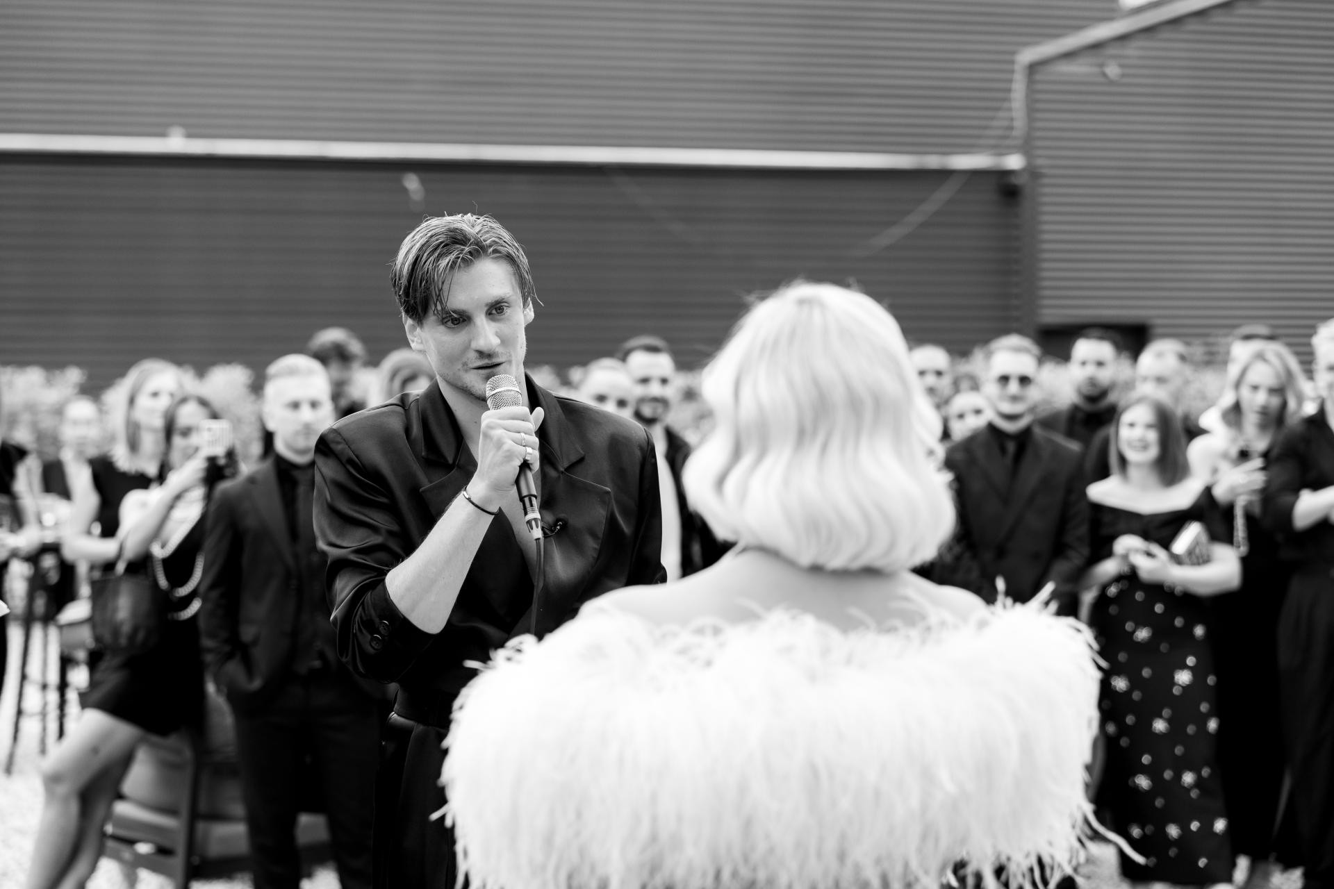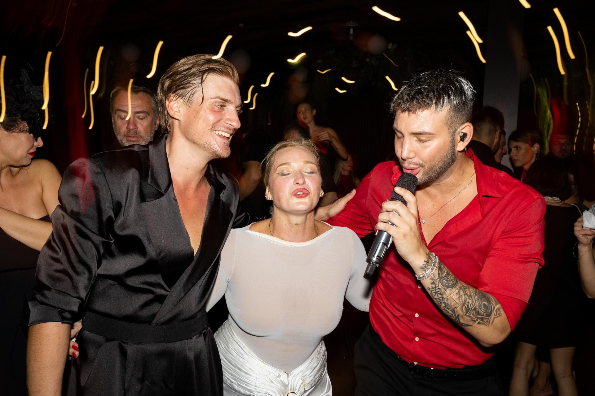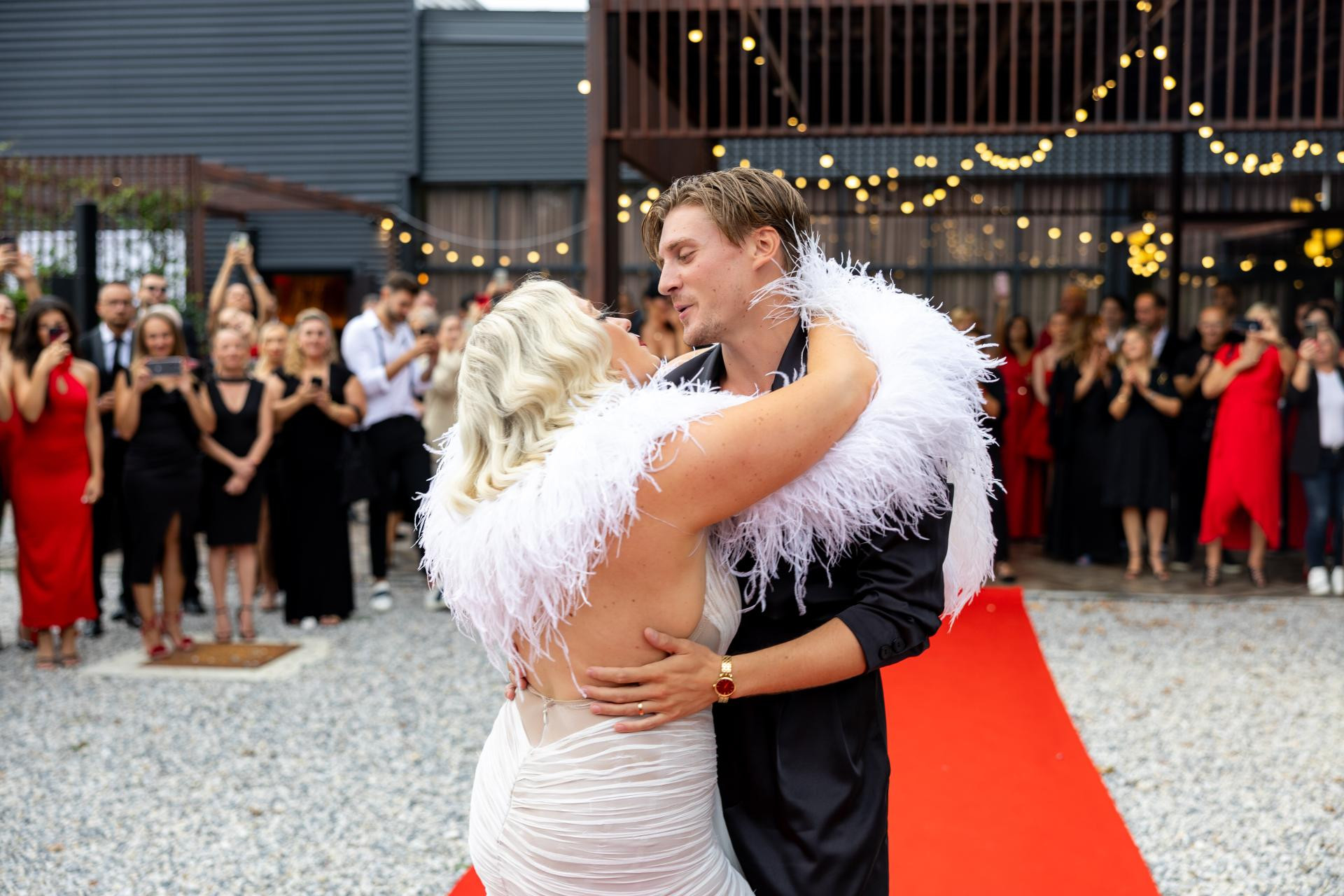 Improvizirani obred, iako simboličan jer su svoje zavjete jedno drugome već izrekli na Korčuli, bio je iznimno emotivan. Vodio ga je njihov bliski prijatelj Hrvoje Banić. Posebno je bila uređena unutrašnjost dvorane – u stilu Moulin Rougea u crnim i crvenim motivima, bez klasičnih cvjetnih dekoracija.