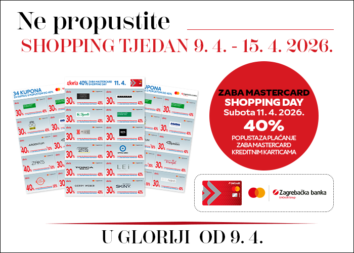 Kupone pronađite uz novi broj tjednika Gloria koji je u prodaji od 9. do 15. travnja, a subotu, 11. travnja, rezervirajte za shopping uz Zaba Mastercard kreditnu karticu – i iskoristite još veće popuste.